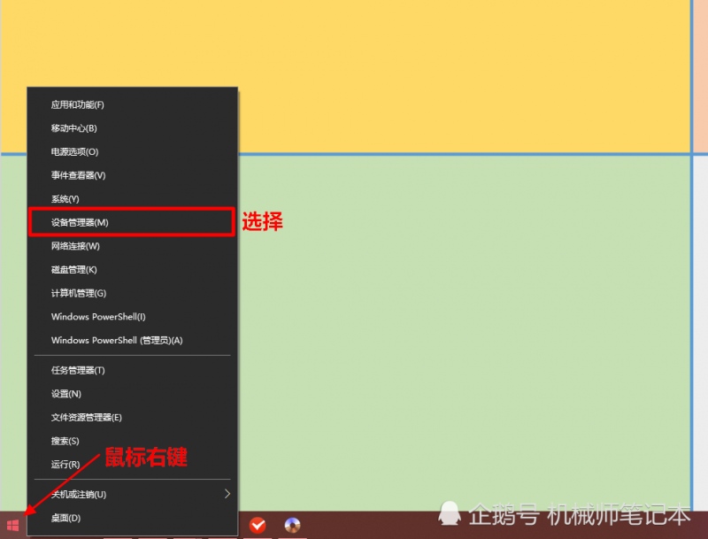 一、在左下角的“开端”图标上,鼠标右键点击,然后在弹出的挑选栏中,挑选“设备办理器”。
