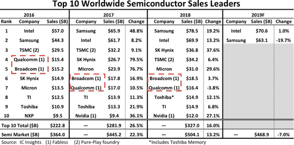 从商场研讨公司IC Insights发布的全球半导体销量领导者排名中能够看出,高通和博通在名次上一向不分上下,可见博通收买高通并不是狮子大开口。