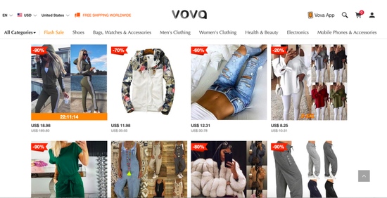 Vova是一个全品类电商渠道,其主页将自己定位成“Best Cheap online Shopping Site”,主打贱价,其出售的产品包含男女服饰、鞋履包袋、个人护理、电子产品等多个类别。在Vova的主页上,你能够买到7美元的裤子、10美元的连衣裙,还有45美元的智能手机。