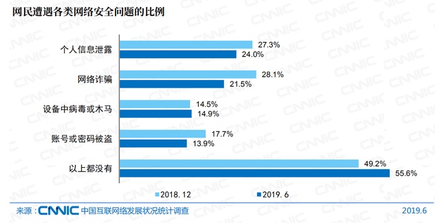 2019年上半年,在上网过程中未遭受过任何网络安全问题的网民份额进一步提高。数据显现,55.6%的网民表明曩昔半年在上网过程中未遭受过网络安全问题,较2018年末提高6.4个百分点。经过剖析网民遭受的网络安全问题发现:遭受网络欺诈的网民份额较2018年末下降显着,降幅为6.6个百分点;遭受账号或暗码被盗、个人信息走漏等网络安全问题的网民份额也有所下降。