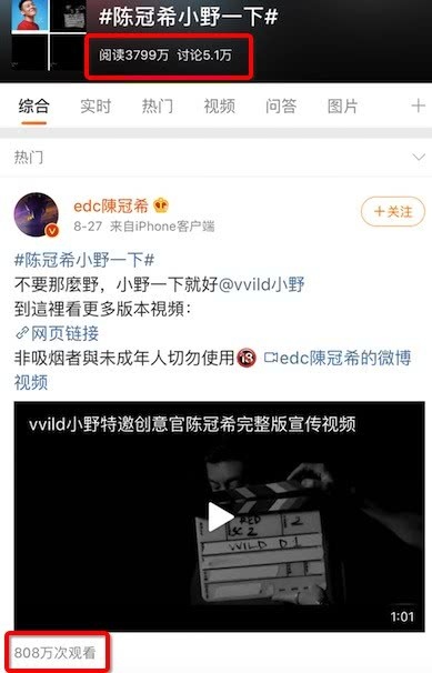 到8月29日正午12点,陈冠希在微博发布的小野TVC视频播映量达到了800万,转发数超越4万,论题阅览3800万,评论5.1万。