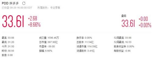 到美股收盘,拼多多股价大涨8.66%,市值到达391亿美元,仅次于阿里巴巴、腾讯、美团点评和京东。
