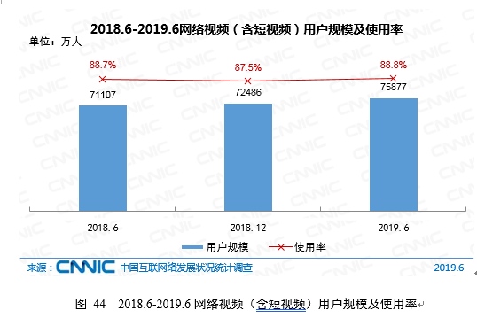 到2019年6月,我国网络视频用户规划达7.59亿,较2018年末增加3391万,占网民全体的88.8%。其中长视频用户规划为6.39亿,占网民全体的74.7%;短视频用户规划为6.48亿,占网民全体的75.8%。