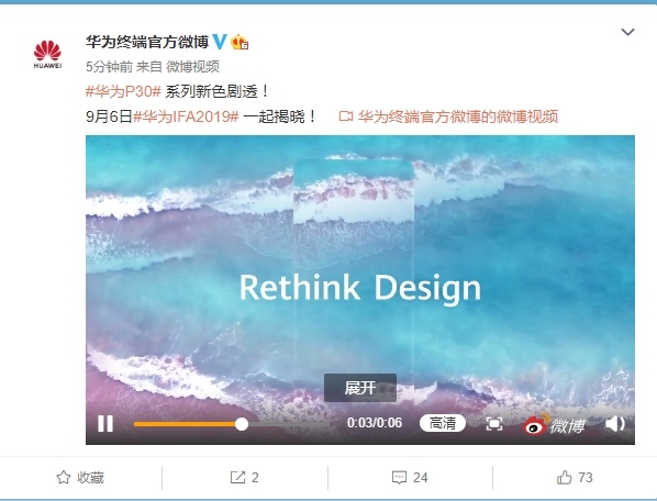 4月11日,华为在上海正式推出了本年的首款年度旗舰华为P30系列机型,自发布后该机以极高的颜值、硬件装备,特别业界顶尖的摄影实力备受全球用户的重视。现在有最新音讯,近来华为终端官方微博宣告,将于9月6日在IFA展会上揭晓P30系列的全新配色,并放出了该配色的宣传片。