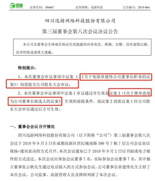 迅游科技(300467.SZ)最新发表的抉择布告中显现,算计代表公司16.35%表决权的股东袁旭、陈俊一起提议革除章建伟的董事长职务,一起推选袁旭为公司董事长。免除理由为,章建伟作为公司董事长,缺少对公司所在职业、发展战略、主营业务的了解,长时间缺席公司战略拟定、运营管理。