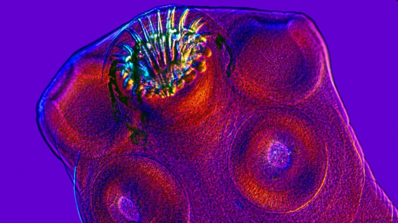 绦虫的身体被称为横裂体,是由许多独自的节片组成。这些节片还有男女之分,最靠近颈部的部分大多是发生精子的雄性,较远的部分是发生卵袋的雌性。事实上,每一个节片都含有大约10万个卵。