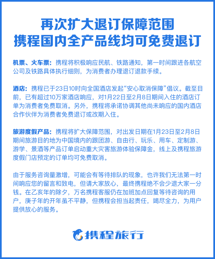 1月24日岁除清晨,我国最大的在线游览渠道携程在其官方微博发布音讯,宣告发动1亿元严重灾祸保证金,并再次扩展退订保证规模,免费取销全国规模内游览产品订单。
