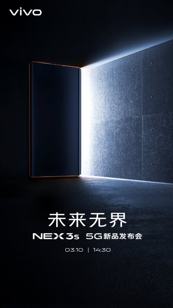 Vivo以宣告NEX 3S 5G新品发布会将于3月10日下午发布,发布会的主题仍然是“未来无界”,暗示vivo NEX 3S 5G的极致全面屏屈服。