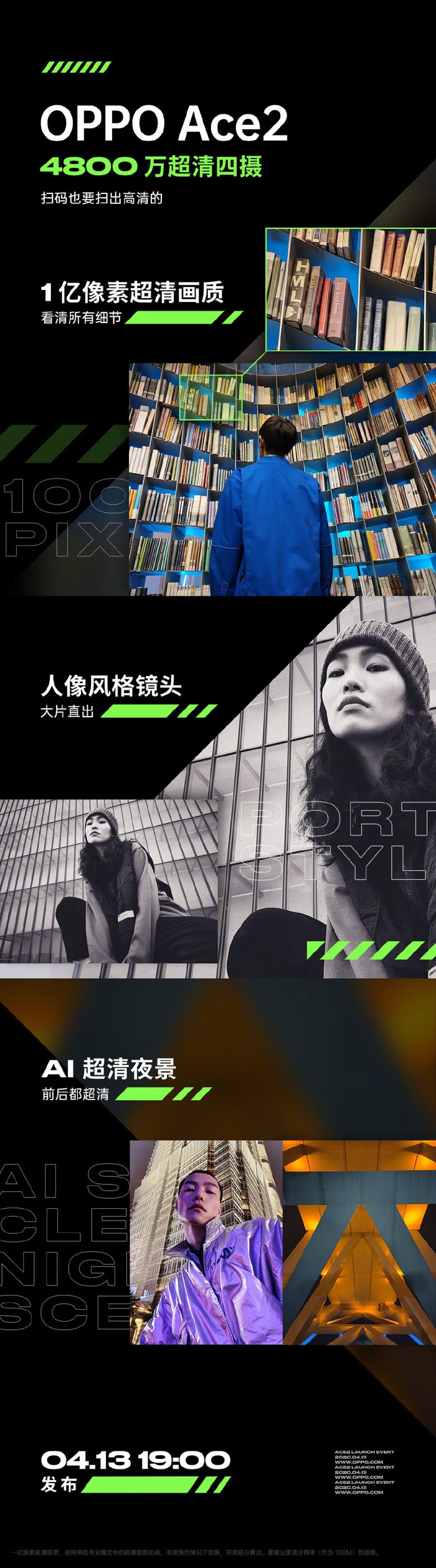 [PConline 资讯]5G手机OPPO Ace2将于4月13日19点举办发布会,OPPO官方在近来发布5G手机OPPO Ace2宣扬图片可了解到OPPO Ace2更多参数装备内容,此前,在工信部入网音讯得知,5G手机OPPO Ace2后置选用后置4800万+800万+200万+200万像素摄像头,从OPPO近来发布OPPO Ace2选用4800万超清四摄,正好印证此前工信部入网音讯。