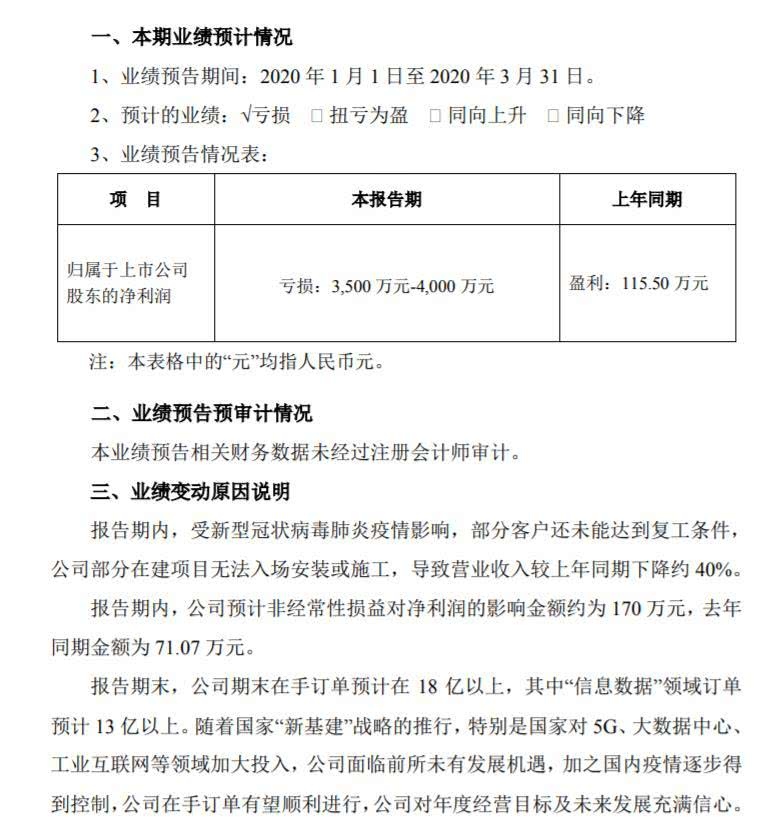 4月9日晚间,依米康发表榜首季度成绩预告,称受新式冠状病毒肺炎疫情影响,运营收入较上年同期下降约40%,估计榜首季度亏本3500万元至4000万元。