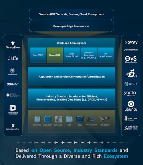 英特尔边际软件套件OpenNESS可协助MEC运营商和开发商完成边际事务的办理和编列,完成事务快速上线、运维高效精准,支撑干流虚拟化技能Docker、Kubernetes、Openstack,支撑5G和增强渠道感知布置,集成英特尔OpenVINO东西包、视频加快卡等公共渠道才能,协助客户完成边际事务的快速开发与布置。
