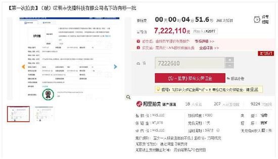 4月13日到4月14日,深圳市快播科技有限公司管理人(快播公司管理人)在淘宝网司法拍卖网络平台上,对深圳市快播科技有限公司(快播公司)名下234项商标揭露拍卖,起拍价4.511万元,经过363 次出价,截止4月14日12点50分,出价已达到688.8110 万元。