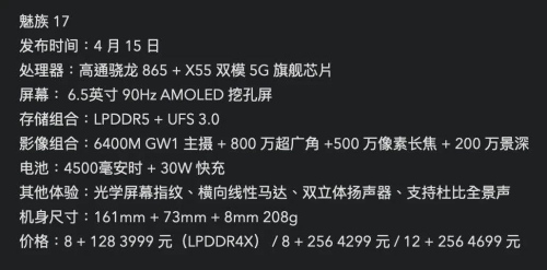 参数方面,魅族17将采用6.5英寸的90Hz AMOLED挖孔屏,搭载高通骁龙865旗舰平台,支持双模5G。后置为6400万主摄+800万超广角+500万长焦+200万景深的AI四摄相机模组,LPDDR5+UFS3.0,X轴线性马达和立体双扬, 4500mAh大电池,以及 30W有线快充。