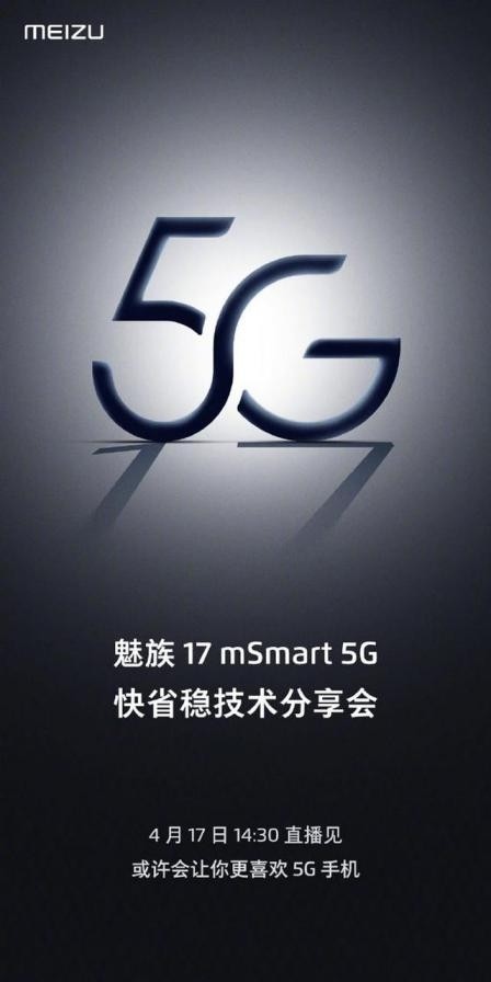 4月14日消息,魅族科技官方微博宣称,将于4月17日举办魅族17 mSmart 5G快省稳线上技术分享会!魅族还晒出了一张带有“mSmart 5G”的海报,证实了魅族新旗舰手机支持5G网络,且很大可能会对游戏和续航进行升级优化。