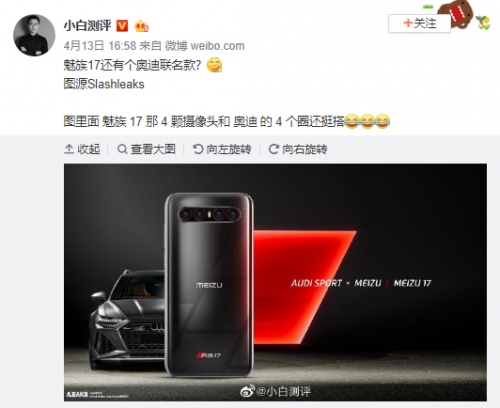 近日,知名数码博主@小白测评更曝出了魅族17将会和奥迪进行联名的消息。如果消息一旦被证实,那么魅族 17 5G旗舰机将会是国产手机中又一家与知名汽车厂商跨界联合的手机产品!外观炫酷炸裂的魅族 17奥迪联名款何时才能现真身?或许4月17日下午14:30的魅族5G技术分享会我们可以找到最终答案!