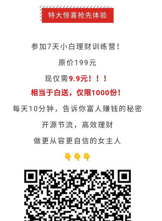 水到渠成,案牍底部蹦出了财商课程二维码:原价199元,现仅需9.9元就能参与7天小白理财训练营。
