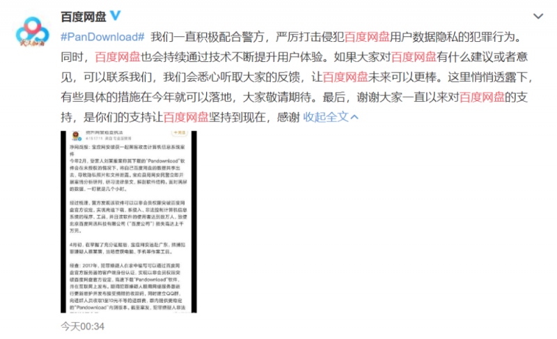 对近期百度网盘下载工具Pandownload作者被捕一事,4月15日清晨,百度网盘官方微博发布音讯回应称,一向活跃合作警方,严厉打击侵略百度网盘用户数据隐私的犯罪行为。一起,百度网盘也会继续经过技能不断的进步使用者实在的体会。
