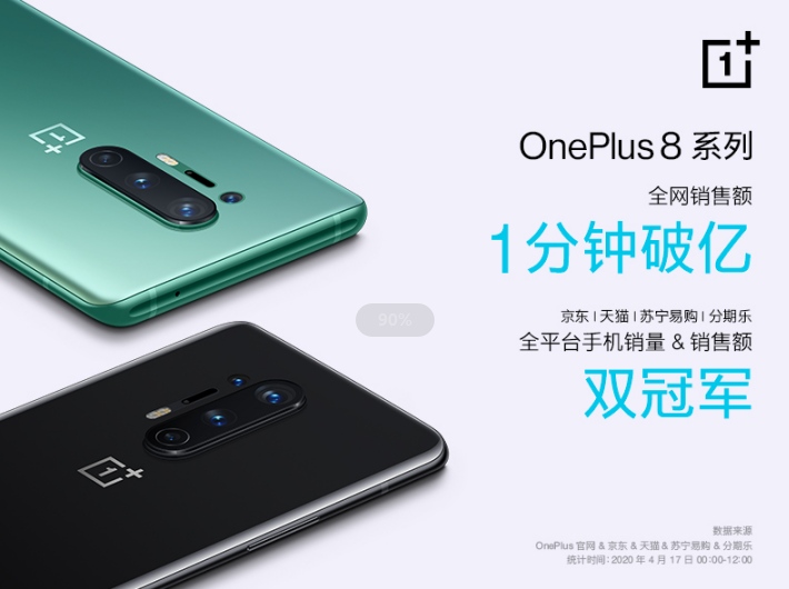 4月17日,刚刚发布的一加 8 系列全面开售,首销战绩火爆,开售后仅 1 分钟全网销售额破亿,并获得京东、天猫、苏宁易购、分期乐全平台手机销量及销售额双冠军。