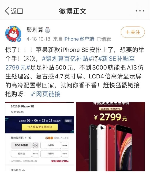 聚合算iPhone SE的500元优惠的抢购规则是18日起参加活动即可取得抽签码,在4月24日8:00发布抽签成果,抽中既能够2799购买iPhone SE。该活动在淘宝主页点击“聚合算”即可进入参加。