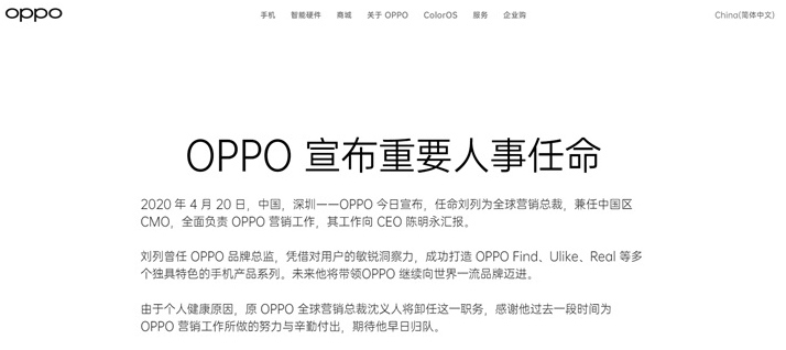 4月20日上午,OPPO宣告录用刘列为全球营销总裁,兼任我国区CMO,全面担任OPPO营销作业,其作业向CEO陈明永报告。