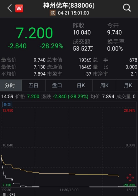 4月21日,停牌2周后的神州优车在股转系统康复转让后,再现闪崩剧情,当天股价跌超28%。接连两个买卖日,神州优车报价跌超44%,市值蒸腾超150亿。