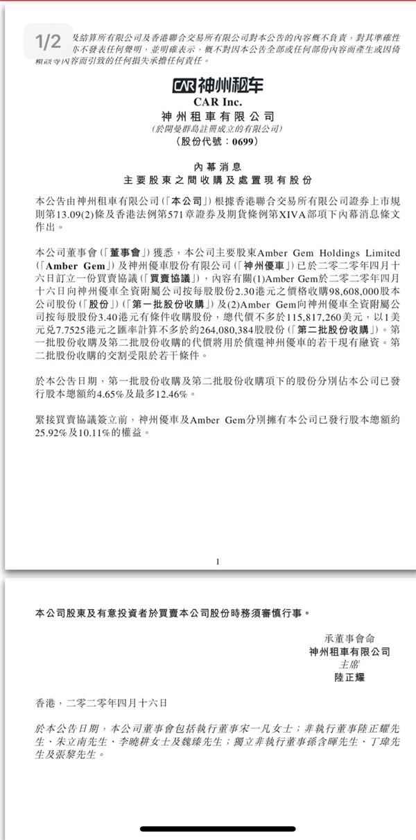 4月16日晚,神州租车发布布告称,其主要股东Amber Gem Holdings Limited(以下简称“Amber Gem”)及神州优车已于当日缔结生意协议,Amber Gem将分两批收买神州租车合计不超越17.11%股份。