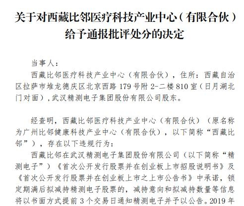 通报显现,经查明,精测电子(SZ:300567)股东西藏比邻医疗科技产业中心(有限合伙)(原名称为广州比邻健康科技产业中心(有限合伙),以下简称西藏比邻),存在以下违规行为:西藏比邻在精测电子《初次揭露发行股票并在创业板上市招股说明书》及《初次揭露发行股票并在创业板上市之上市布告书》中许诺,确定期满后拟减持精测电子股票的,减持意向和拟减持数量等信息将以书面方法提早3个买卖日告诉精测电子并予以布告。