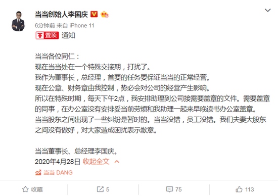当当股东之间呈现了一些胶葛是暂时的。当当没错,职工没错。咱们夫妻大股东之间没有做好,对咱们形成困扰表明歉意。