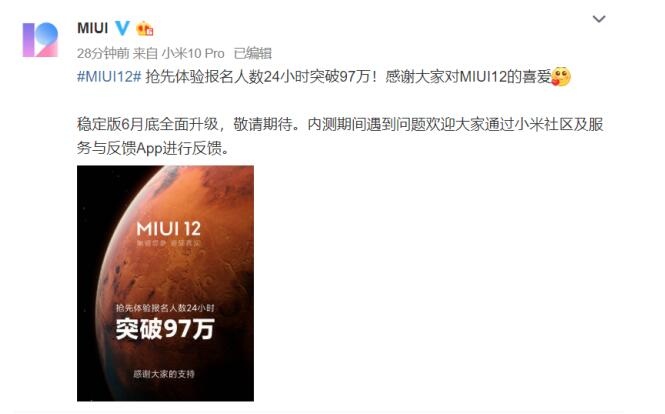 4月27日,MIUI12正式发布,挑战世界最强iOS。发布后好评如潮,内测报名人数创历史新高。今天,MIUI官方微博发布消息:“#MIUI12# 抢先体验报名人数24小时突破97万!感谢大家对MIUI12的喜爱”。成为历史上MIUI内测报名人数最火爆的一次。