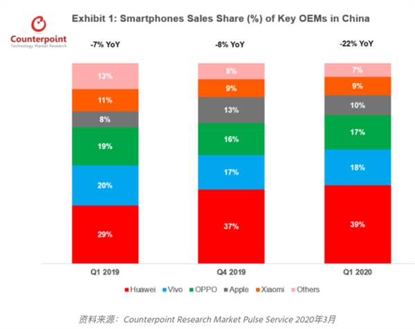 商场调研组织Counterpoint最新查询显现,因为疫情影响,2020年榜首季度我国智能手机出售同比下降22% 。而在疫情期间,华为的商场占有率上升到近40%,是仅有一个在疫情中完成同比正增加的智能手机厂商。
