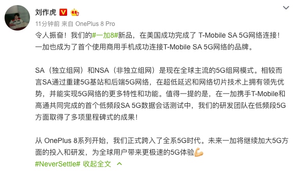 2020年5月9日,一加手机正式宣布成功连接美国运营商T-Mobile的SA 5G网络,成为首个使用商用手机成功连接T-Mobile SA 5G网络的品牌。