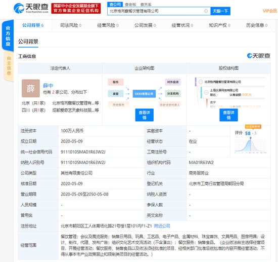 新浪科技讯 5月12日下午音讯,天眼查多个方面数据显现,5月9日,北京格芮馥餐饮办理有限公司建立,该公司注册资本100万人民币,法定代表人为爱奇艺副总裁薛中。