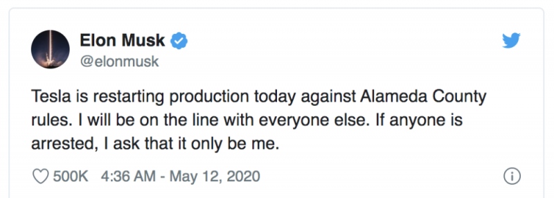 特斯拉CEO马斯克5月11日发布推文表明,该公司将违背阿拉米达县政府规则强行复工。