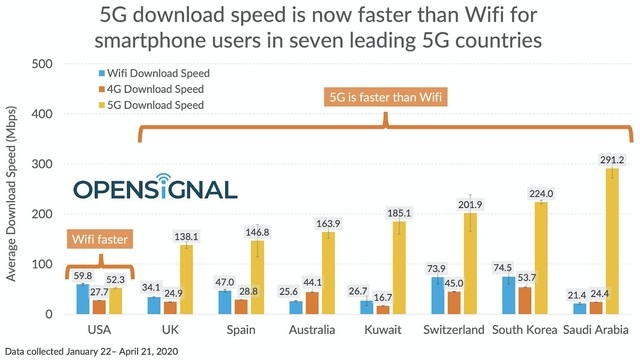 Opensignal在本年1月22日到4月21日期间实测了美国、韩国、英国、瑞士、澳大利亚、西班牙、科威特与沙特阿拉伯共8国的5G上网均匀速度,并与4G、WiFi上网速度作比较。