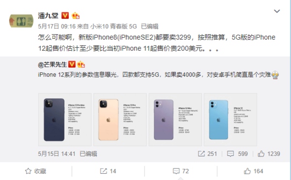 据悉,全新的iPhone 12系列很或许要延期上市,此前有音讯称iPhone12的起价格或许会与iPhone 11相等,不过近来小米工业出资部合伙人潘九堂却表明,相较于iPhone 11,iPhone 12的价格至少要贵200美元。