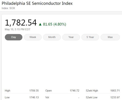 5月19日音讯,据国外新闻媒体报道,受疫苗等方面利好音讯影响,美国三大股指周一全线大涨,费城半导体指数涨4.8%。