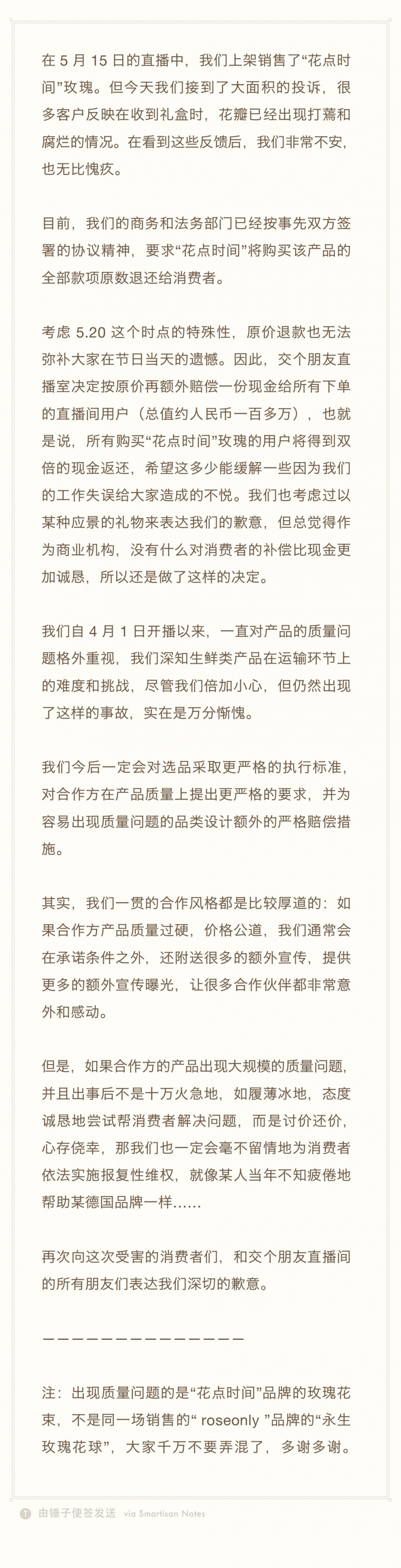 关于“花点时刻”玫瑰质量事情的致歉和补偿办法