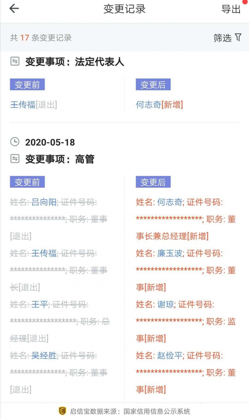 据启信宝显现,比亚迪汽车有限公司发作多项工商改变,王传福卸职法定代表人并不再担任公司董事长,接任者为何志奇,何志奇一起担任公司总经理职务。