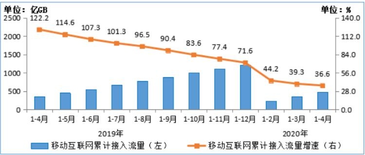 2019-2020年1-4月移动互联网累计接入流量及同比增速状况