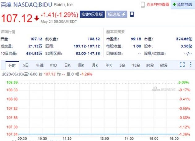 5月21日晚间音讯,百度开盘跌1.29%,盘前一度跌超8%。