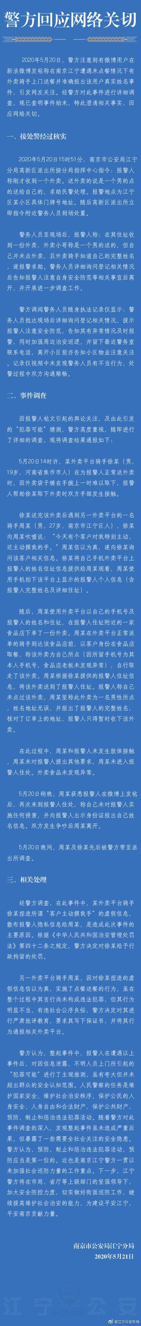 新浪科技讯 5月22日午间音讯,据南京市公安局江宁分局音讯,2020年5月20日, 警方留意到有微博用户在新浪微博发帖称在南京江宁遭受未点餐状况下有外卖骑手上门送餐并精确报出该用户实在名字事情,引发网友注重。经警方对此事情进行具体查询,现已查明事情始末,特此弄清相关现实,回应网络关心。