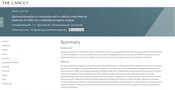 氯喹和羟氯喹开始看起来像是有期望医治COVID-19的医治办法。依据包含触及几十名患者的开始研讨,不过,有一项研讨后来被撤销了,由于要修正。后来的研讨对其成果产生了置疑。从本月早些时候的《新英格兰医学杂志》的一篇文章比较了大约给予羟氯喹的800名患者和未给予这种药物的约560名患者,发现该药物的运用和生存率之间 "没有明显的相关"。