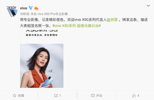 5月25日,vivo官方微博正式宣告,刘雯将代言vivo X50系列旗舰级印象手机:“用专业印象,记载精彩夜色。欢迎vivo X50系列代言人@刘雯 ”。