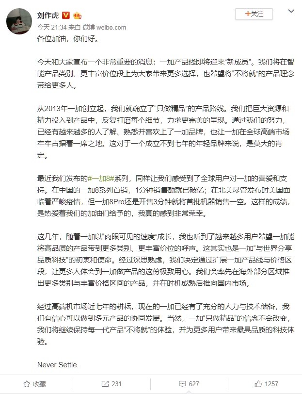 5月26日晚,一加CEO兼创始人刘作虎通过微博宣布,未来一加将会扩充新的产品线,同时推出更多不同价位段的产品。