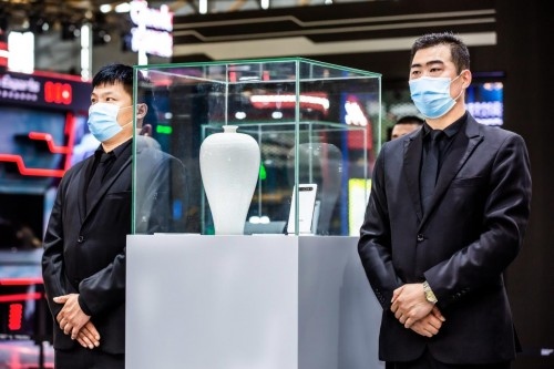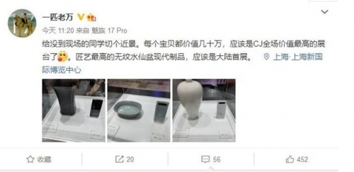 作为台湾名窑的晓芳窑,以仿古瓷闻名。晓芳窑的主人蔡晓芳先生在30多年的仿古瓷器的烧制中,诞生了一万多个品种!而此次魅族在现场展出的是晓芳窑汝窑青瓷无纹水仙盆、晓芳窑定窑白瓷划花连纹梅瓶,及晓芳窑黑瓷葵口四方花插。魅族科技负责人万志强透露:“每个宝贝都价值几十万,应该是本次展览全场价值最高的展台了。并且这次陶瓷匠艺最高的无纹水仙盆现代制品,为大陆首展。 ” 同时在展览上可以看出,陶瓷与同款配色的魅族17 Pro放在一起,所形成的美感,将传统艺术与现代科技的完美融合体现得淋漓尽致。
