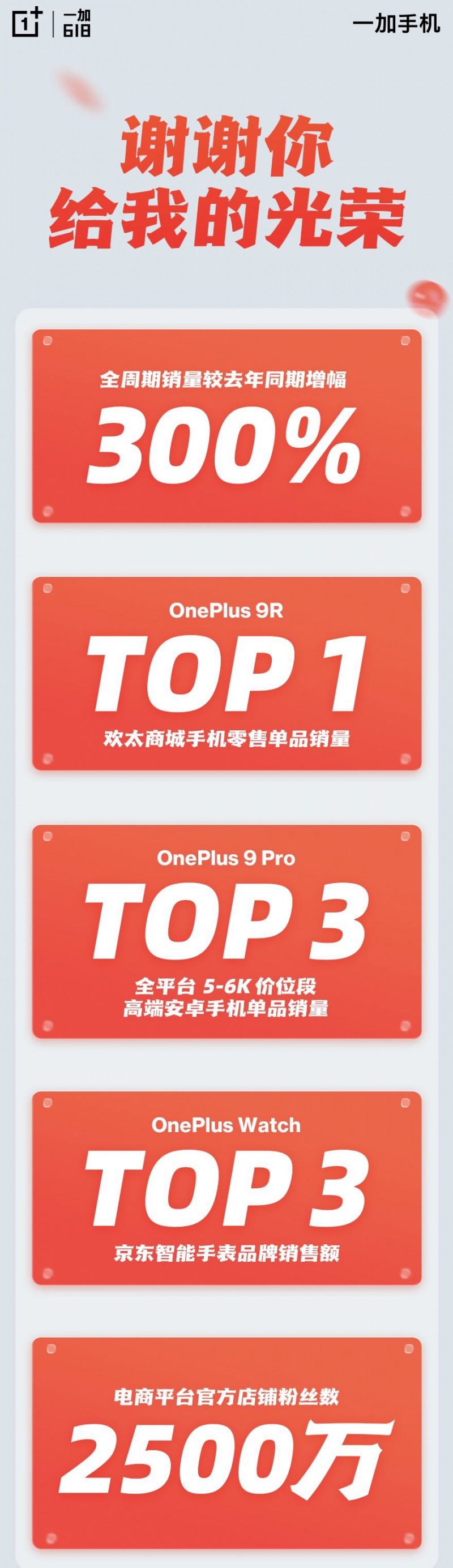 618购物节今日迎来高潮,各大平台与厂商纷纷发力冲刺最后成绩。一加手机在众多品牌中脱颖而出,捷报频传。战报显示6月1日-6月18日期间,一加手机销量较去年同期增幅300%;一加 9R拿下欢太商城手机零售单品销量第一名;一加 9Pro获得全平台5-6K价位段高端安卓手机单品销量TOP3;一加手表获得京东智能手表品牌销售额Top3;电商平台官方店铺粉丝数突破 2500 万!