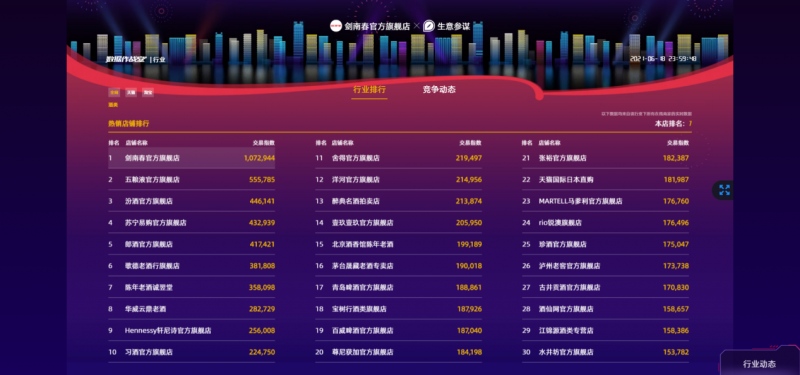 2020年,在整体商业环境较为严峻的情况下,剑南春呈逆势增长状态,2020年的“618”年中购物节期间,也获得了白酒品牌旗舰店交易指数第一名的好成绩。2021年,剑南春持续崛起,再次摘取桂冠,其不仅在渠道市场表现强劲,更是在高端布局方面取得新突破。