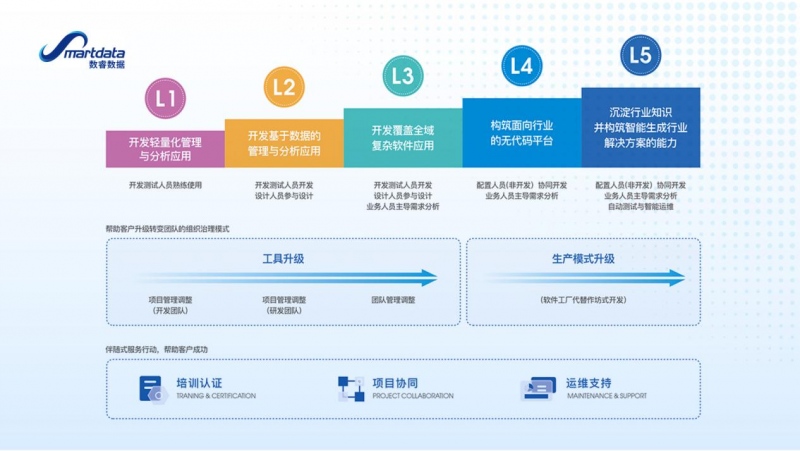 依托于Smartdata的无代码服务能力,数睿数据将其总计为L1~L5五个阶段。数睿数据总裁刘超表示,当下合作的大部分厂商以产研级合作居多,还处在L1~L3的阶段,更多是一种“工具的升级”;而数睿数据的产线级合作面向L4、L5,是一种“生产模式的升级”。