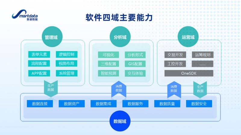 基于对企业架构的解构,数睿数据将Smartdata的功能划分为四个域:管理域(沉淀数据资产)、数据域(定义数据资产)、分析域(认知数据资产)、运营域(运用数据资产)。