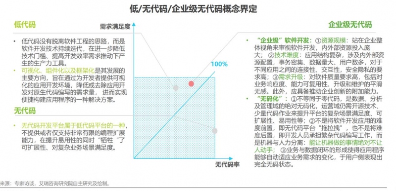 “无码化”:①不等同于零代码,是数据、分析及管理域的绝对无码化,运营域仍需开源技术,少量代码作业来提升平台的复杂场景满足度、可 扩展性、易用性等;②不是将软件开发应用的难度前置,即无代码平台“拖拉拽”,也不是将难度后置,即开发人员承担繁杂代码编写工作,而是机器与人力分离:能让机器做的事情绝对不让人动手;③业务与数据闭环的形成使得应用程序能够自动适应业务需求的变化,于用户侧表现出完全无码状态。
